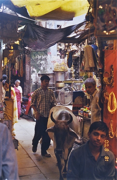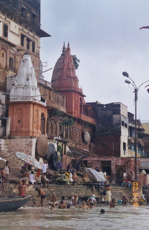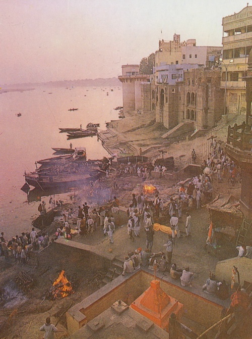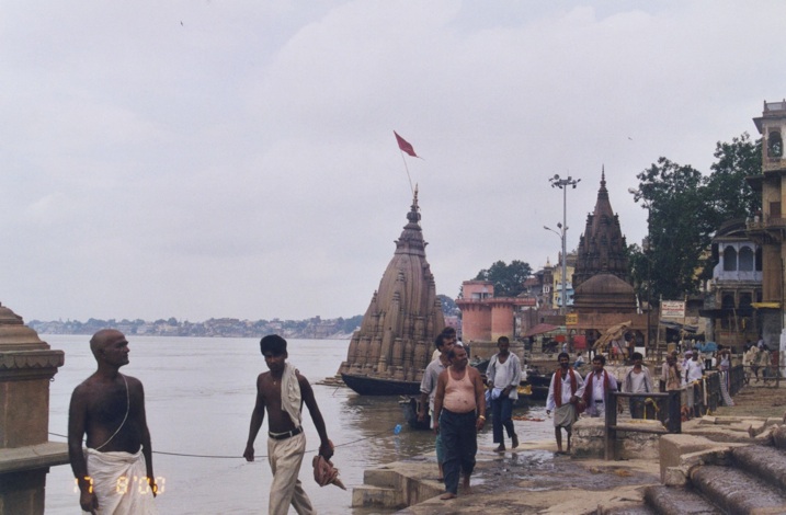 Le Manikarnika Ghat est l’un des ghats crématoires. C’est ici précisément que votre serviteur, sautant de la barque sur ce qu’il pensait être la berge et n’était en fait qu’un tapis de cendres flottant sut l’eau - et il pleuvait alors à verse - s’est retrouvé dans l’eau jusqu’à mi-cuisse... Et dans sa précipitation pour en sortir, s’est éraflé tout du long une jambe... Ambiance...