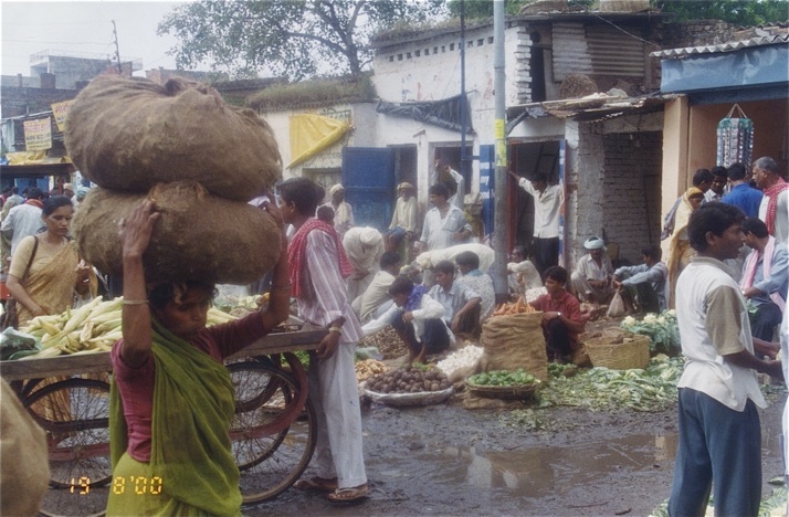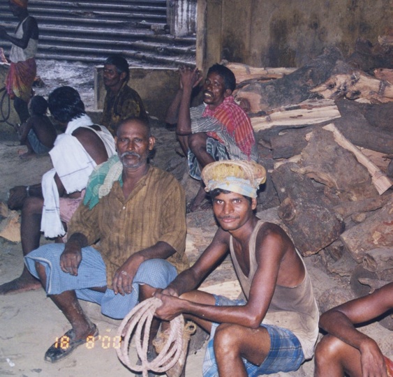 Sous le regard indifférent de ces porteurs de bois de santal qui profitent de la pluie pour se reposer. (Nous avons attendu près d’eux la fin de l’averse et sommes rentrés dare-dare à l’hôtel désinfecter la blessure au tibia... Ambiance...). En contrebas, à une dizaine de mètres, des indiens éloignent à l’aide de perches les chiens qui s’approchent trop près d’un bûcher où on entrevoit une jambe, un pied qui dépasse... Ambiance...
