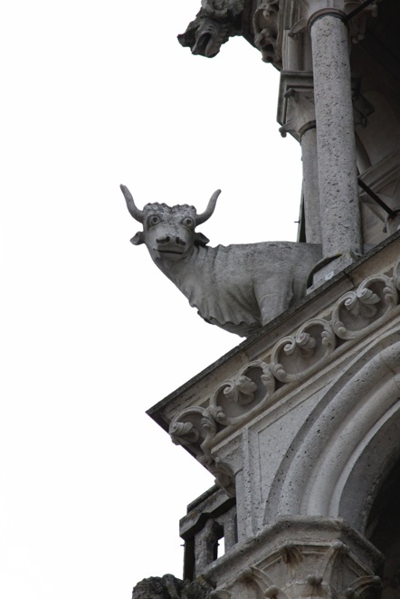 Un des seize grands boeufs grandeur nature disposés dans les tabernacles d’angle des deux tours de la façade ouest.